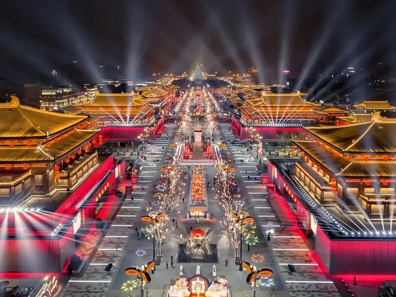 In the evening, get ready for a captivating visit to Datang Ever Bright City. The central axis scenic boule-vard of the Datang Ever Bright City spans approximately1500 meters from north to south. It is adornedwith nine sets of thematic group sculptures depicting the prosperity of emperors, historical figures, heroictales, and more. These sculptures vividly showcase the grandeur of the Tang Dynasty in realms such asreligion, literature, art, and technology, embodying the magnificence of a great nation.